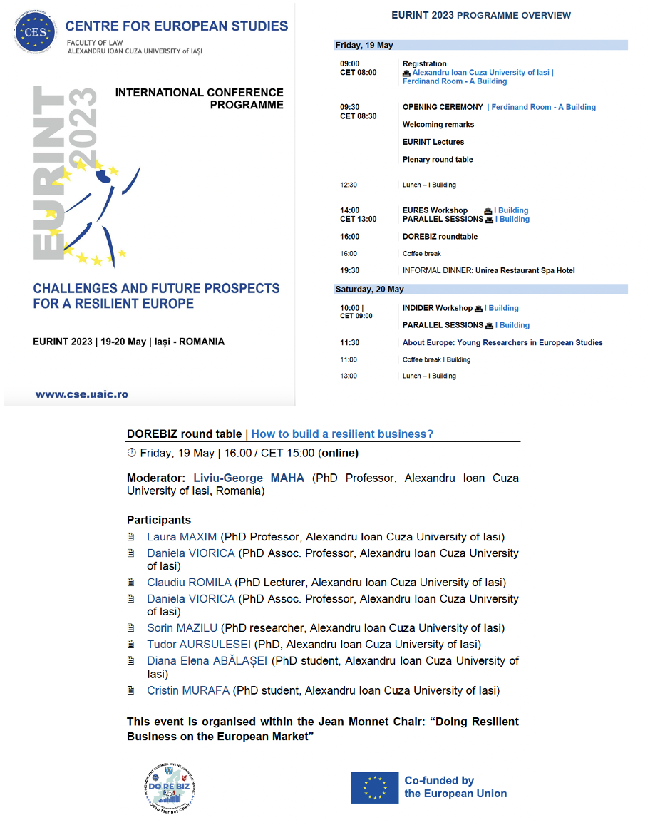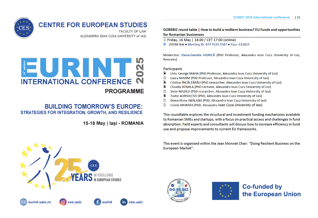 The first roundtable of the DO RE BIZ project inaugurated the public debates planned within the Jean Monnet Chair “Doing Resilient Business on the European Market.” Its primary objective was to explore how businesses, particularly Romanian SMEs, can strengthen resilience in the context of rapidly changing economic, technological, and policy environments. The discussion aligned with the project’s mission to promote understanding of EU mechanisms, increase awareness about the functioning of European markets, and foster dialogue among academics, students, civil society and local stakeholders.