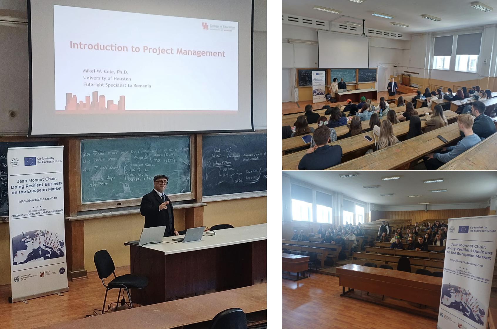 The seminar delivered by Prof. Mikel W. Cole represented an important component of the DO RE BIZ project’s educational dimension, complementing the series of roundtables and study visits aimed at disseminating knowledge about European economic integration, business resilience, and EU funding mechanisms. As a Fulbright Specialist with extensive international experience in organizational planning and educational leadership, Prof. Cole brought an external perspective—both comparative and practice-oriented—on how project management competences serve as strategic tools for strengthening business resilience in complex, uncertain environments.